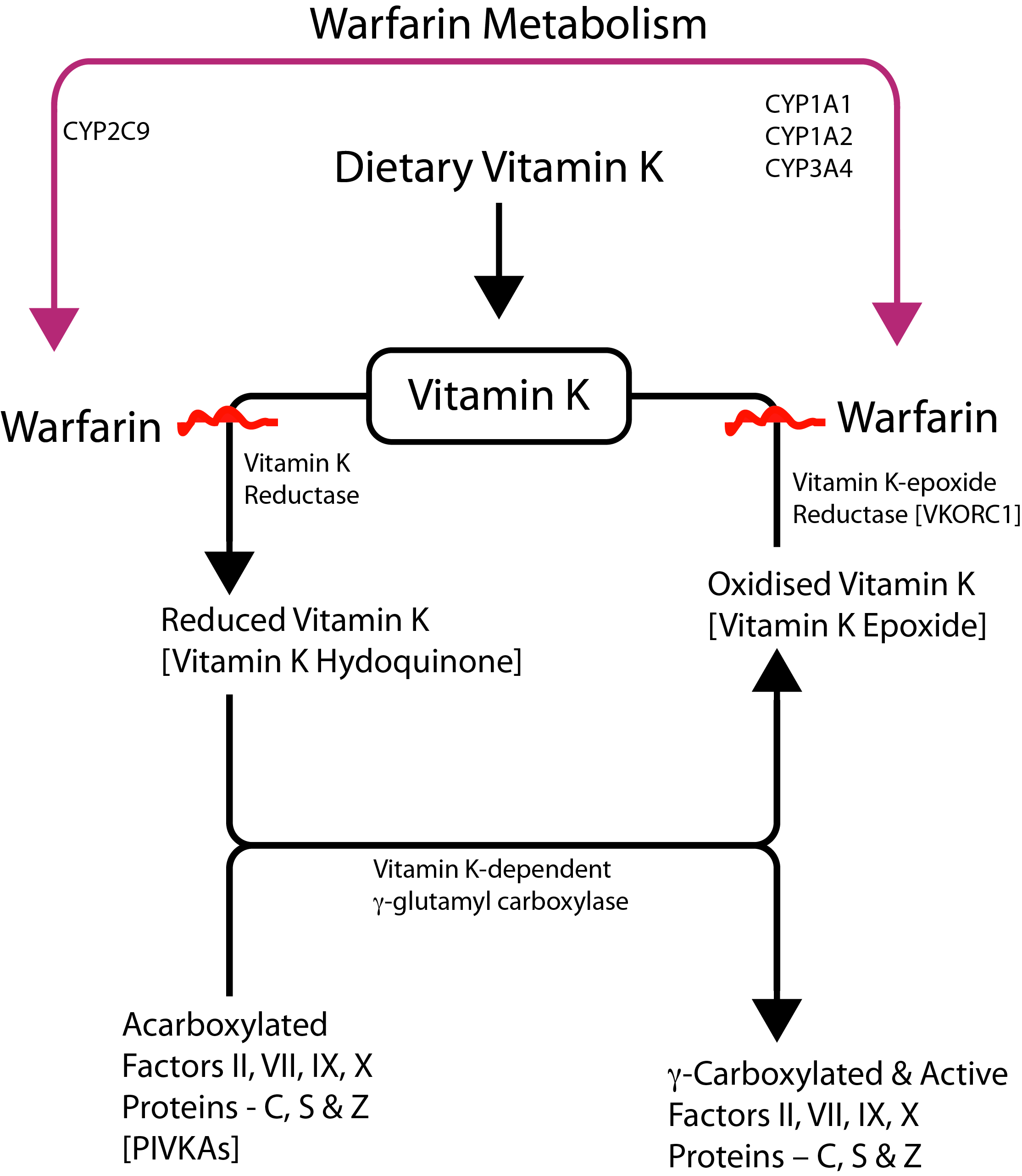 Warfarin | Vitamin K Antagonist. Inhibits γ-carboxylation of Factors II, VII, IX and X [+ Proteins C, S and Z.] Click HERE for a diagram outlining Vitamin K metabolism and the action of warfarin |